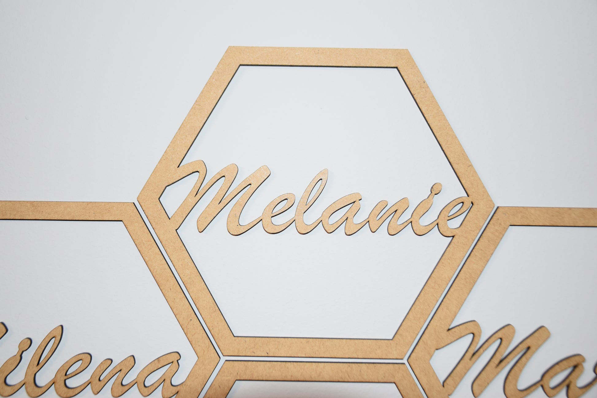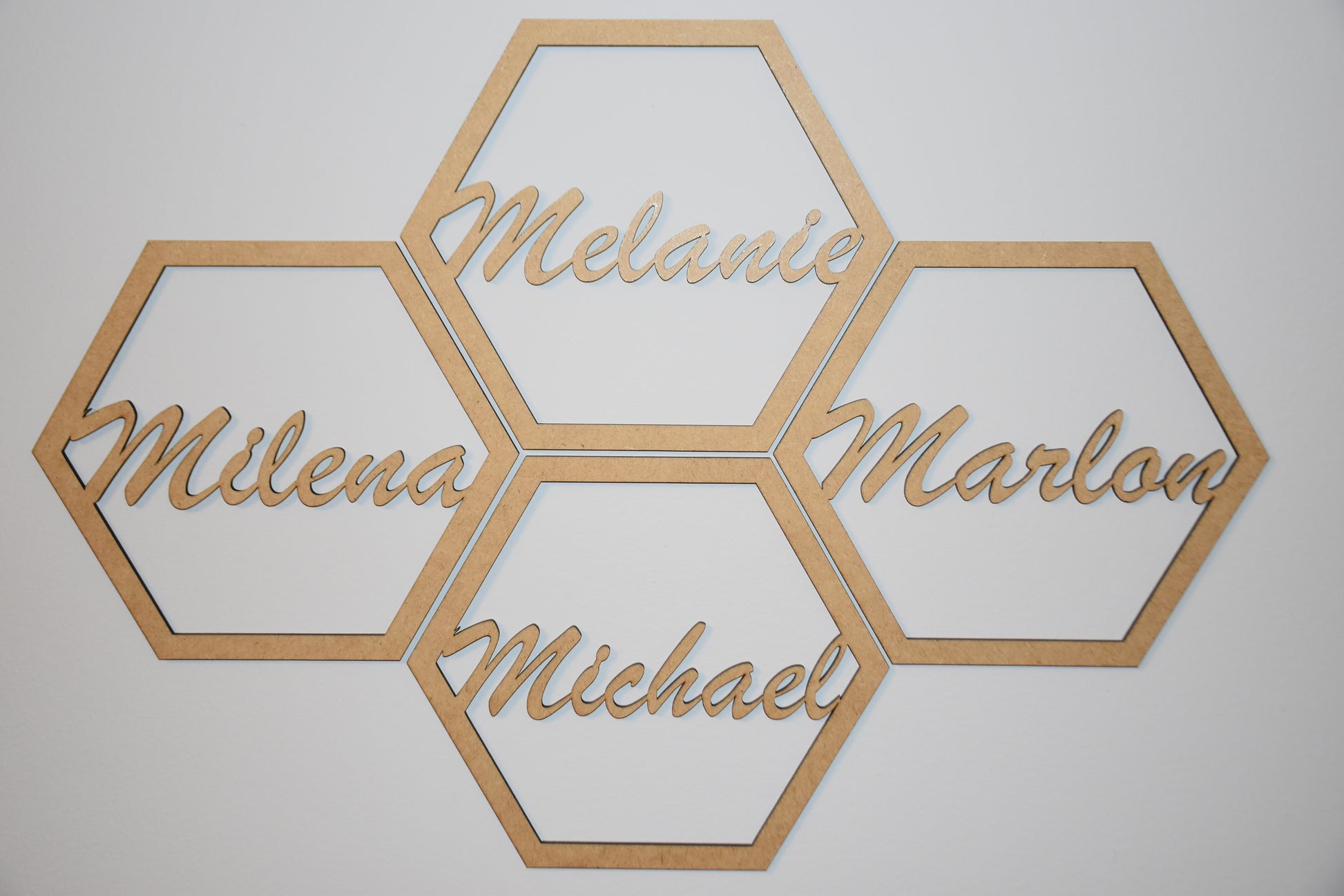 Verwandeln Sie Ihre Wand in ein Kunstwerk, das Ihre Familie und Ihre Liebsten ehrt. Bestellen Sie jetzt Ihre personalisierten Namensschilder im Hexagondesign und machen Sie Ihr Zuhause noch einzigartiger!